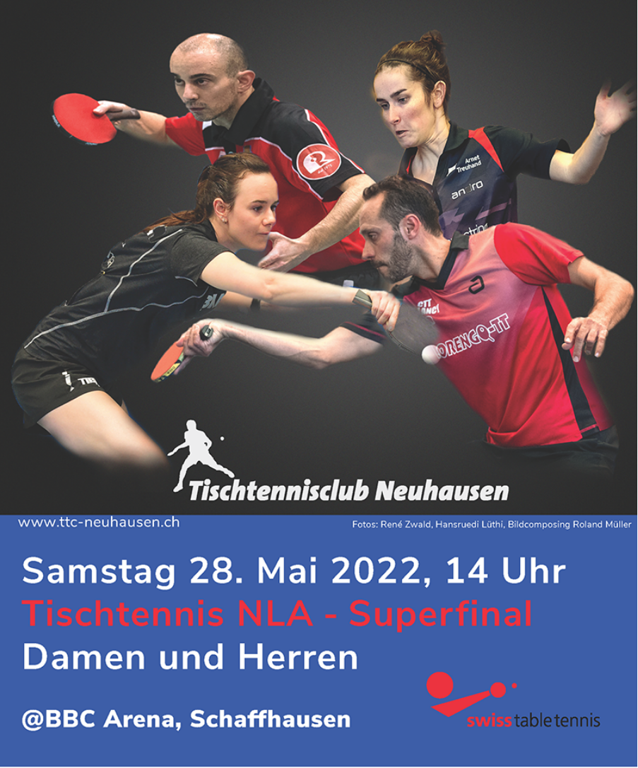 Le 28 mai 2022, les amis du tennis de table suisses auront rendez-vous à la BBC-Arena à Schaffhouse à l’occasion des superfinales 2022. Chez les Dames et les Messieurs, les équipes de Neuhausen, de Rapid Luzern, du ZZ-Lancy et de Lugano s’affronteront dans le mode best-of-1 pour désigner le Champion suisse de 2022. Les superfinales auront lieu dans la salle des Kadetten Schaffhouse et se dérouleront en même temps que les Championnats d’Europe de cyclisme en salle des juniors. Les fans du sport schaffhousois auront ainsi la possibilité de suivre deux sports attrayants en direct sur place.