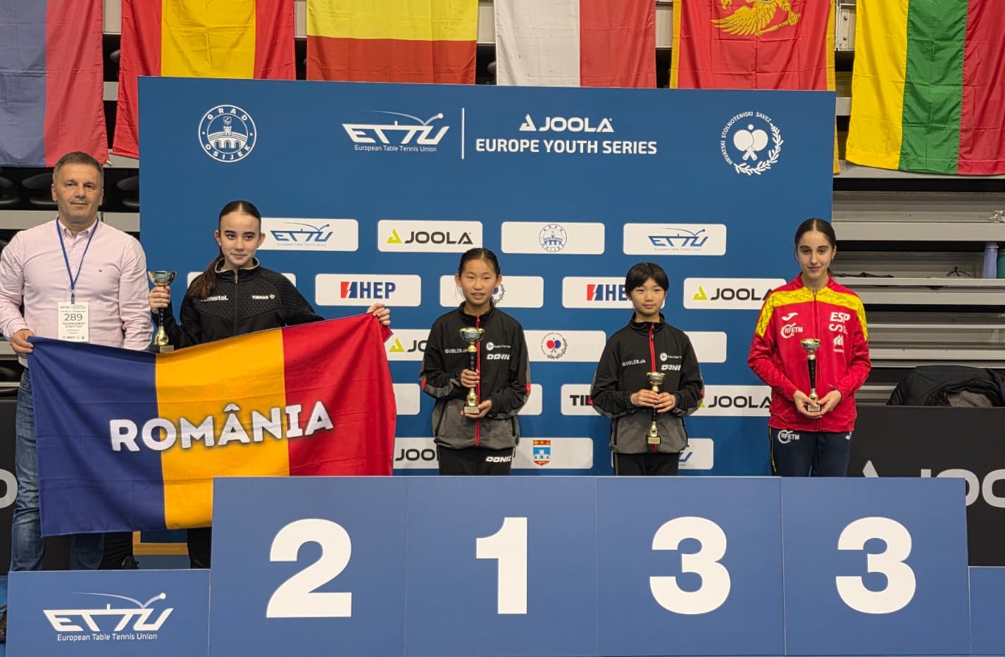 Im U13-Doppel wiederum stiessen Emily Wu/Elina Hu bis in den Viertelfinale vor, wo sie jedoch im fünften Satz mit 8:11 knapp scheiterten. Enya Hu und ihre Partnerin Bara Cupáková aus Tschechien ihrerseits gaben im gesamten Turnierverlauf lediglich gegen die rumänischen Finalgegnerinnen einen Satz ab und gewannen in souveräner Manier.