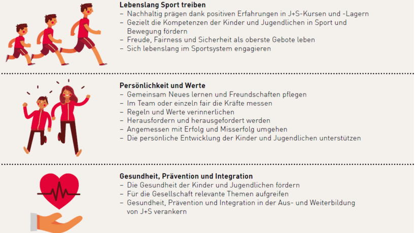 Die regelmässige Teilnahme an J+S-Aktivitäten soll bei Kindern und Jugendlichen zu positiven Erlebnissen füh­ren und sie dazu anregen, lebenslang Sport zu treiben. Dabei stehen die folgenden Wirkungsziele im Fokus: