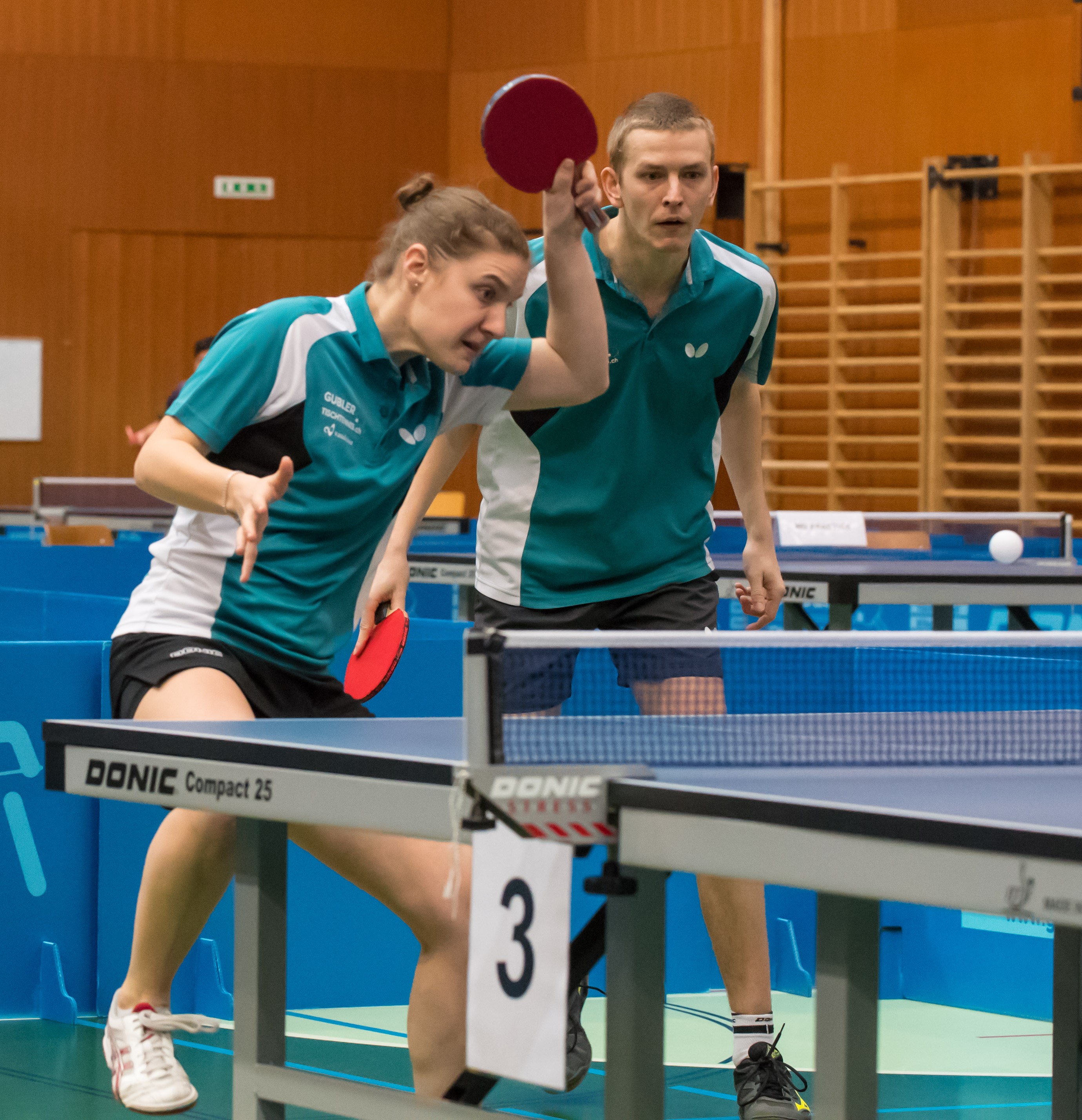 Die Titelverteidiger im Herren-Doppel, Christian Hotz und Elia Schmid, scheiterten im Viertelfinale an den stark spielenden Lokalmatadoren Gael Vendé und Yoan Rebetez. Die an Nummer 1 gesetzten Hotz und Schmid setzten sich zuvor zwar problemlos mit 3:0 gegen das Doppel Meier/Klee durch, gegen die Schweizermeister des Jahrs 2016 in Tenero schieden sie nach einem harten Kampf 2:3 aus. Rebetez/Vendé setzten sich mit 9:11 / 11:8 / 11:7 / 10:12 / 11:8 durch. Im Halbfinale treffen sie nun auf ein weiteres Romand-Doppel, Nicolas Simonet und Sam Boccard, welche in ihrem Viertelfinale Champod/Memmi ausschalteten. Auch Lionel Weber und Filip Karin als Nummer 2 standen gegen das Dopppel Schaufelberger/Moser im Viertelfinale kurz vor dem Ausscheiden. Erst mit 17:15 im fünften Satz nach dem Abwehren diverser Matchbälle konnten sich Weber und Karin über den Einzug in die morgigen Halbfinals freuen. Dort treffen sie morgen auf Lars Posch und Dimitri Brunner.